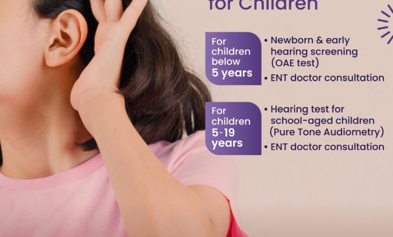 For children below five years, OAE (Otoacoustic Emissions) screening along with ENT consultation will be provided. For school-going children between 5 and 19 years, Pure Tone Audiometry and ENT consultation will be offered at Free of cost.
